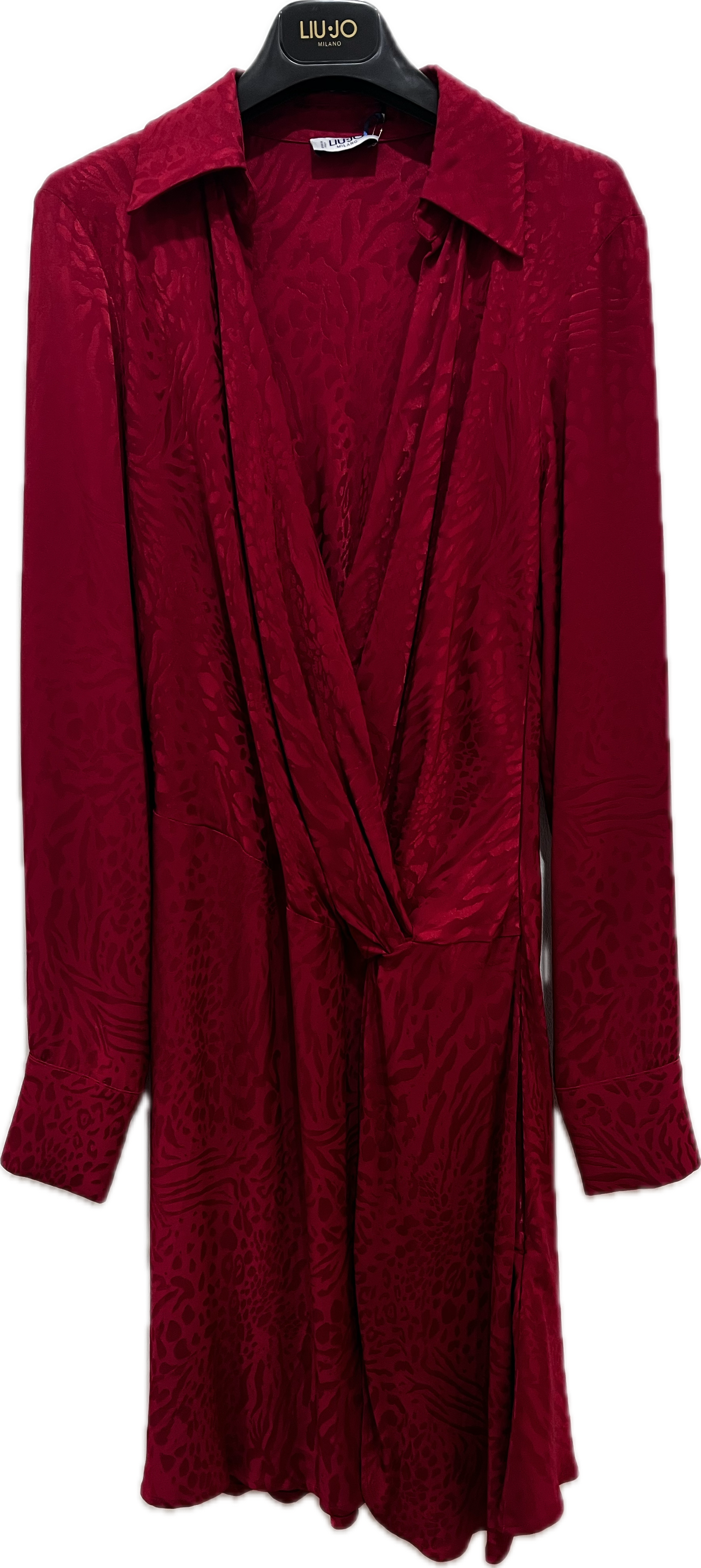 Dettagli: colletto, stampa animalier tono su tono, scollo a v incrociato in vita